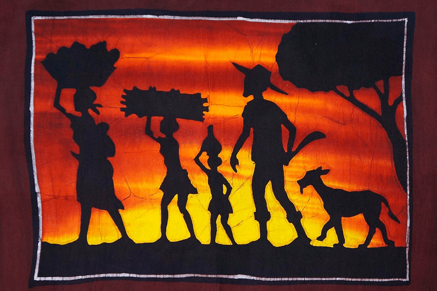 Une famille africaine d’agriculteurs de retour du champ à la tombée de la nuit, est peinte sur ce batik africain Existe en 2 Tailles. T1 : 32×58 cm T2 : 60×100 cm