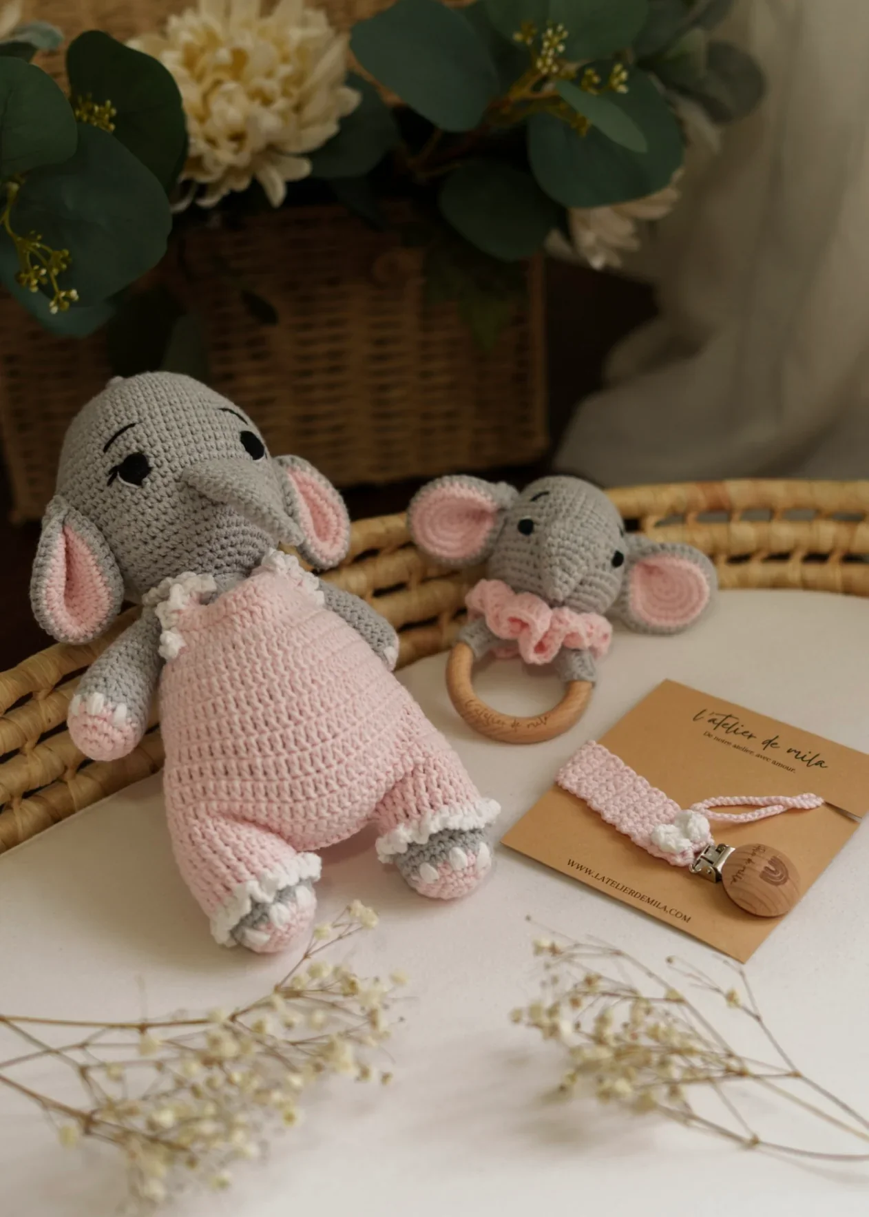 Découvrez notre Coffret Douceur Luna, une création pensée pour célébrer les premiers instants de bébé avec délicatesse et raffinement. Chaque élément a été soigneusement confectionné à la main à partir de matériaux de qualité, alliant douceur, sécurité et charme intemporel.