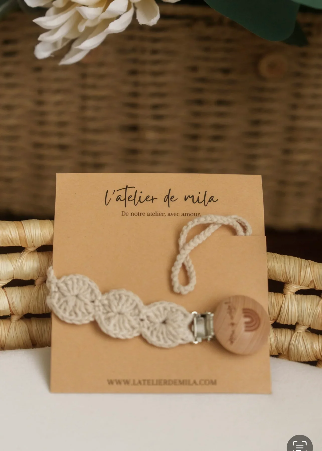 Pratique et élégante, cette attache-suce maintient la tétine de bébé à portée de main tout en ajoutant une touche raffinée à sa tenue.