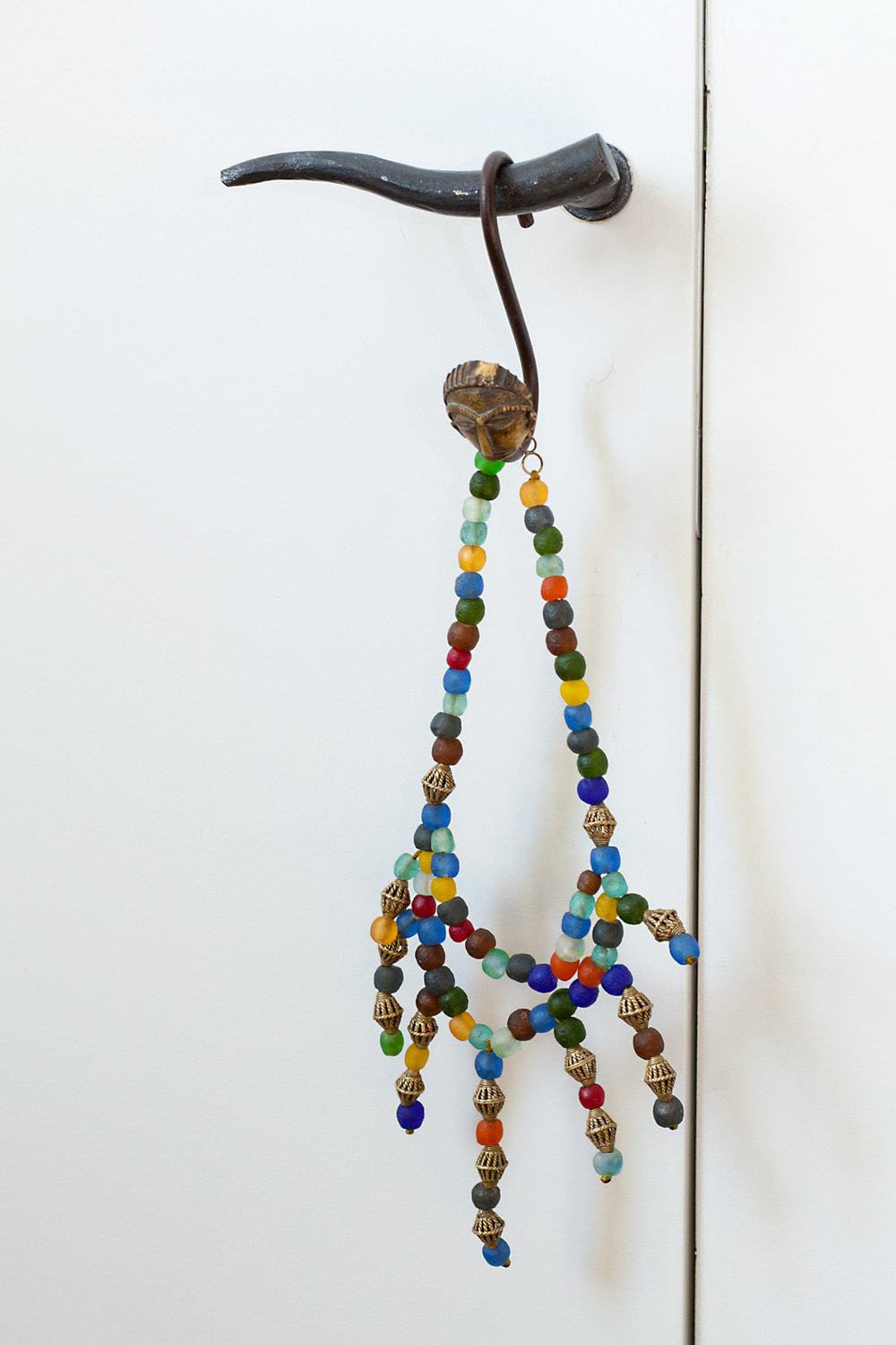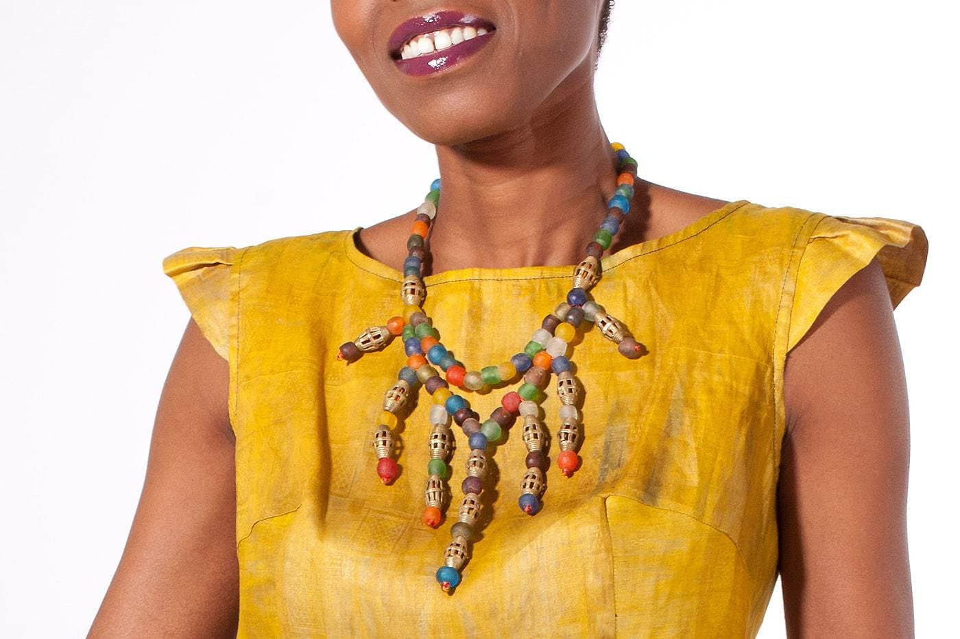 Collier africain crée avec de jolies perles en pâte de verre recyclée et bronze Akan. Le collier idéal pour un joli décolleté.
