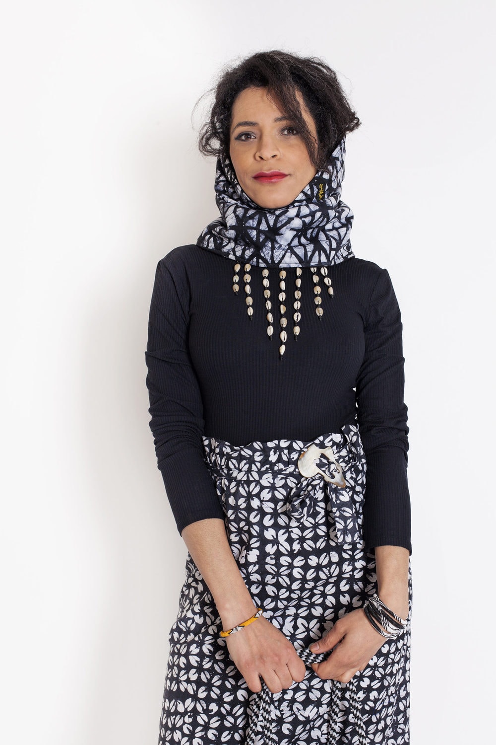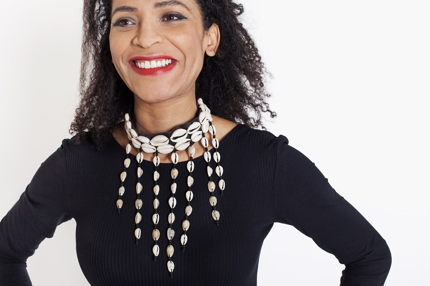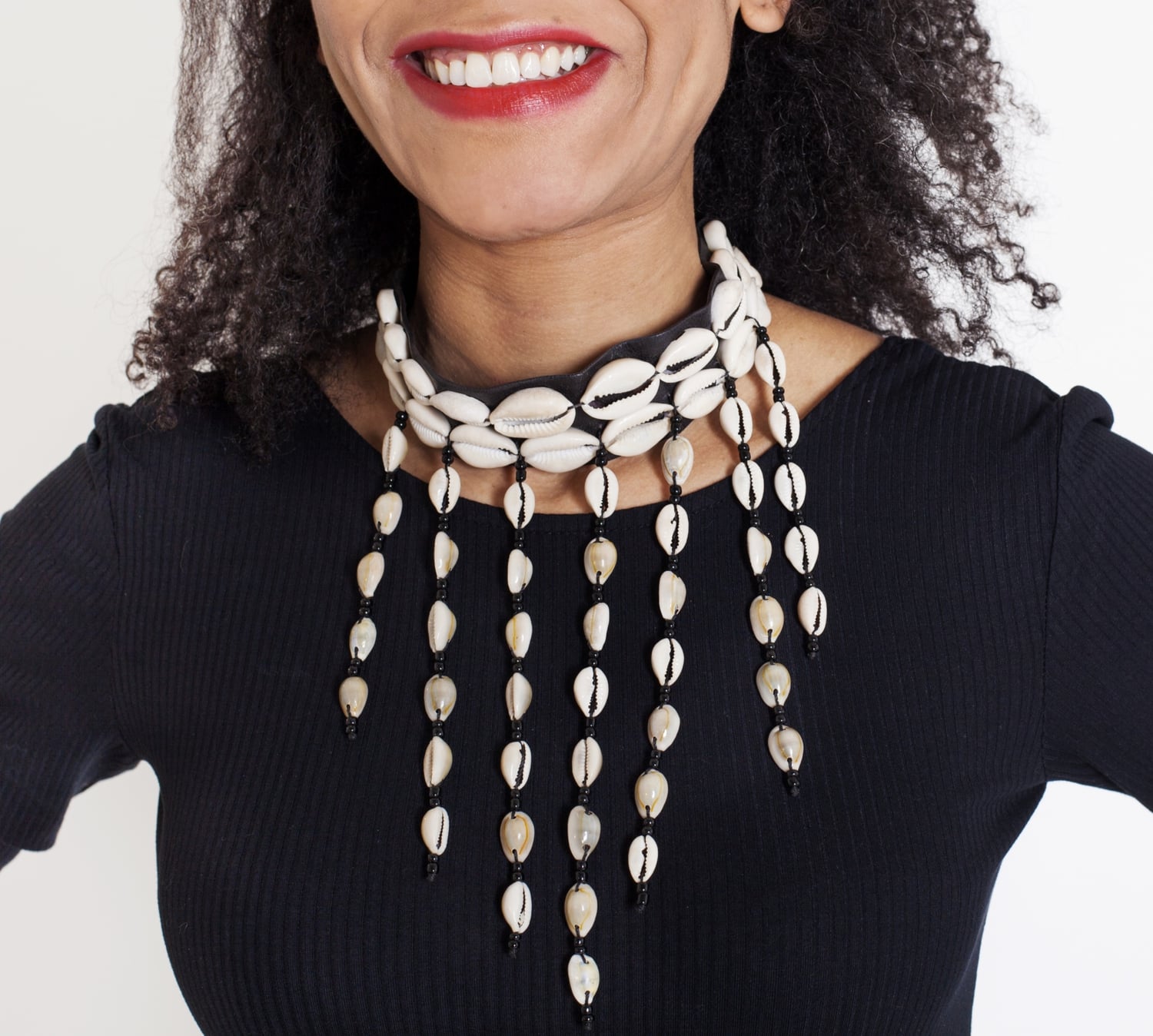 Collier de cauris et cuir créé en Afrique de l’Ouest. Ces coquillages blancs servaient autrefois de monnaie d’échange.