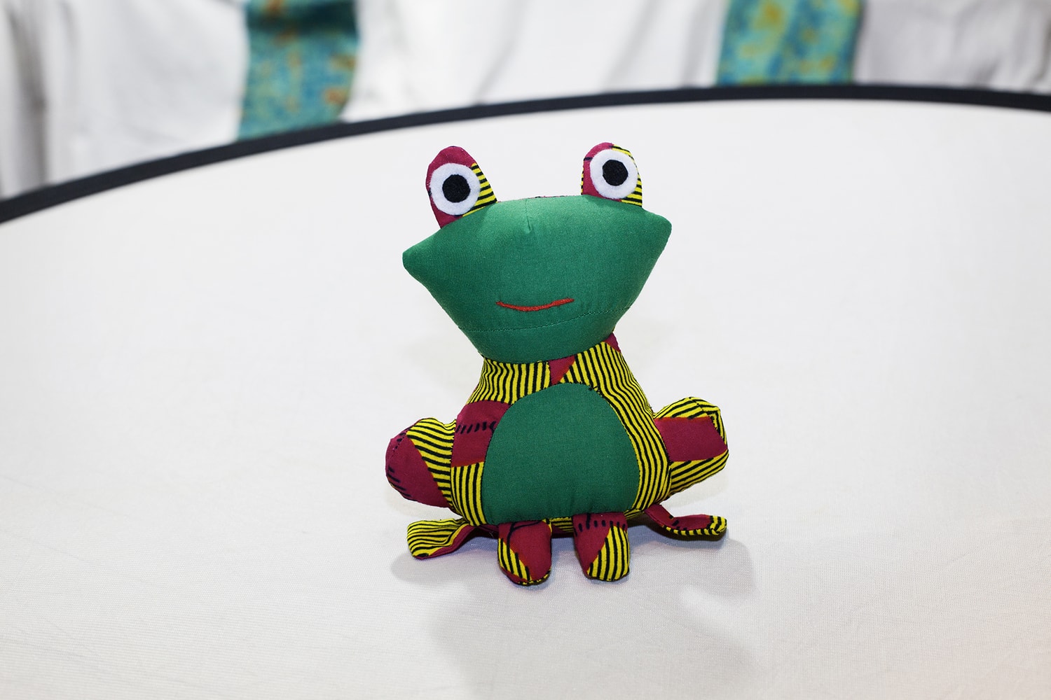 Grenouille en tissu africain créé au Togo avec une association de femmes handicapées. Disponible en plusieurs couleurs. Hauteur : 16 cm