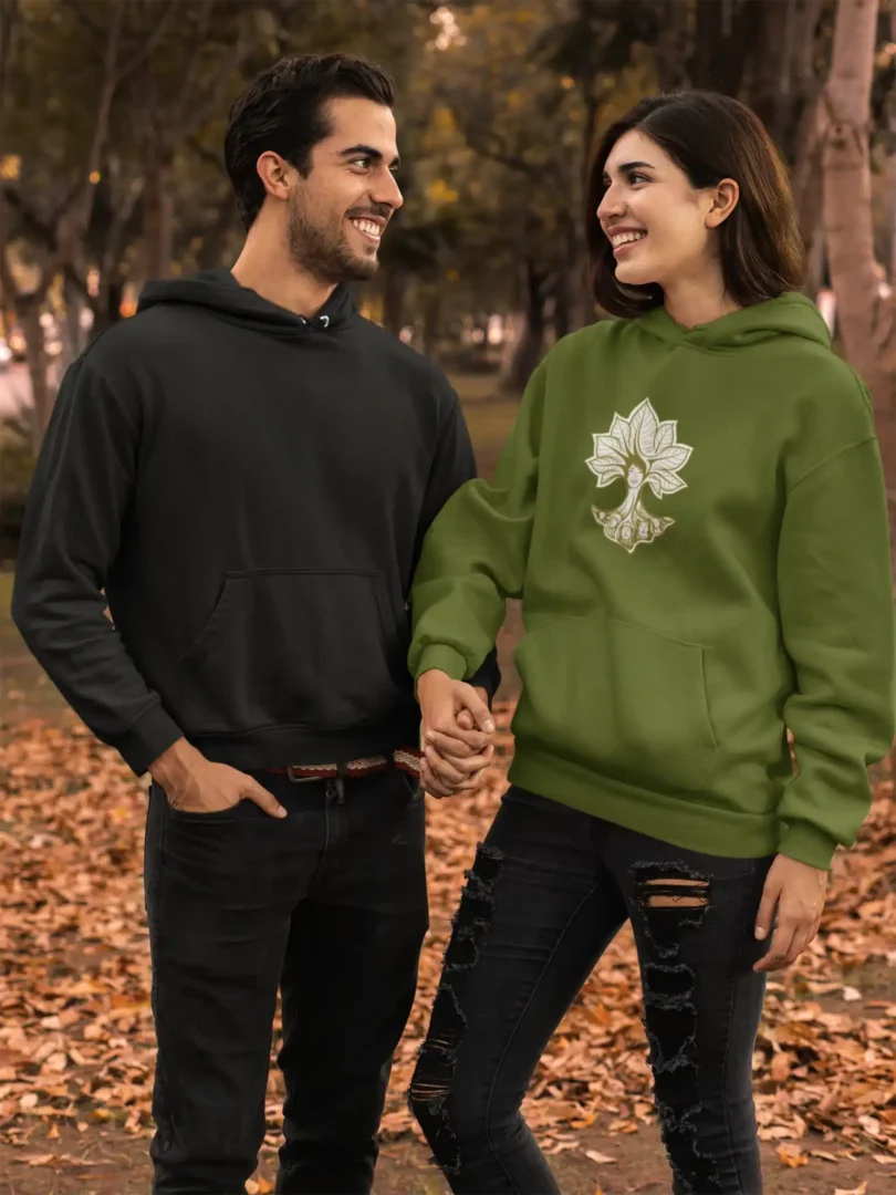 Par ailleurs, sa couleur verte naturelle évoque la forêt et la terre. Ce choix renforce le thème de l’ancrage, du respect des origines et de l’équilibre entre passé et futur. Ce hoodie s’adresse à tous ceux qui veulent honorer leurs racines tout en avançant avec fierté.