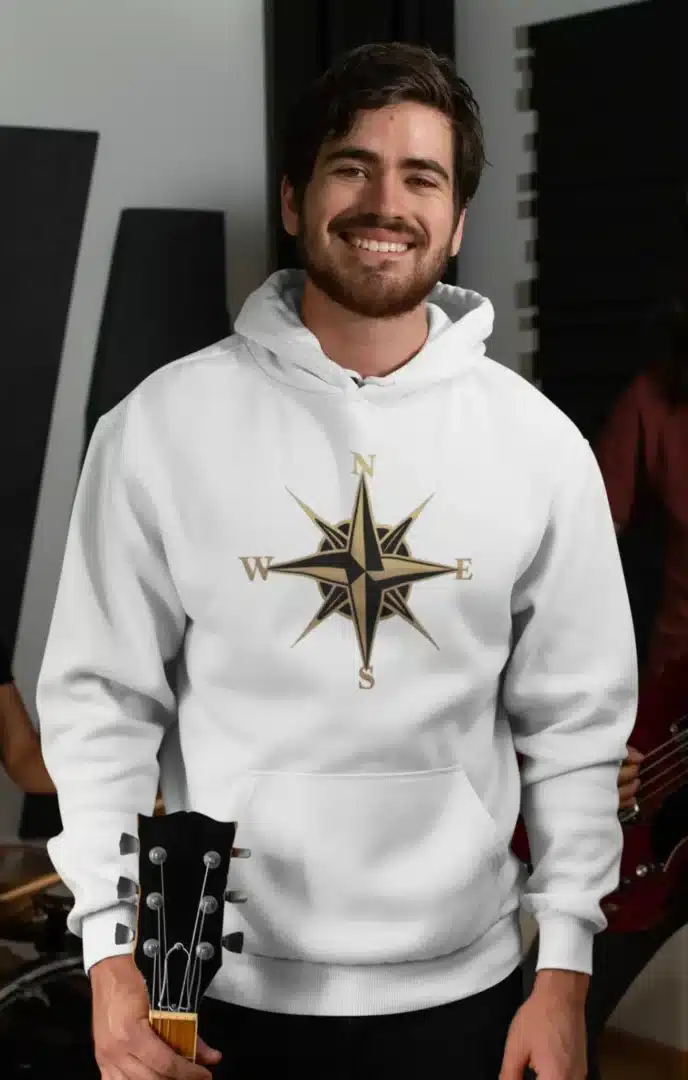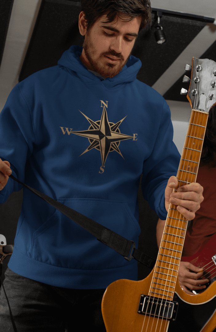 Un hoodie arborant un motif de boussole dorée, idéal pour un style élégant et audacieux. Disponible en bleu navy et blanc.