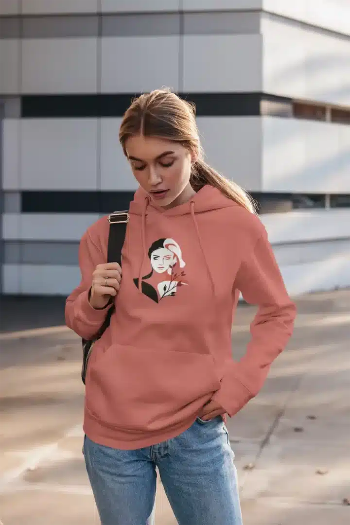 Un hoodie avec un dessin artistique féminin, idéal pour un style tendance et sophistiqué. Disponible en rose et blanc.