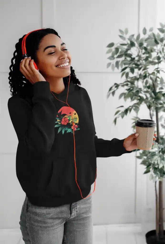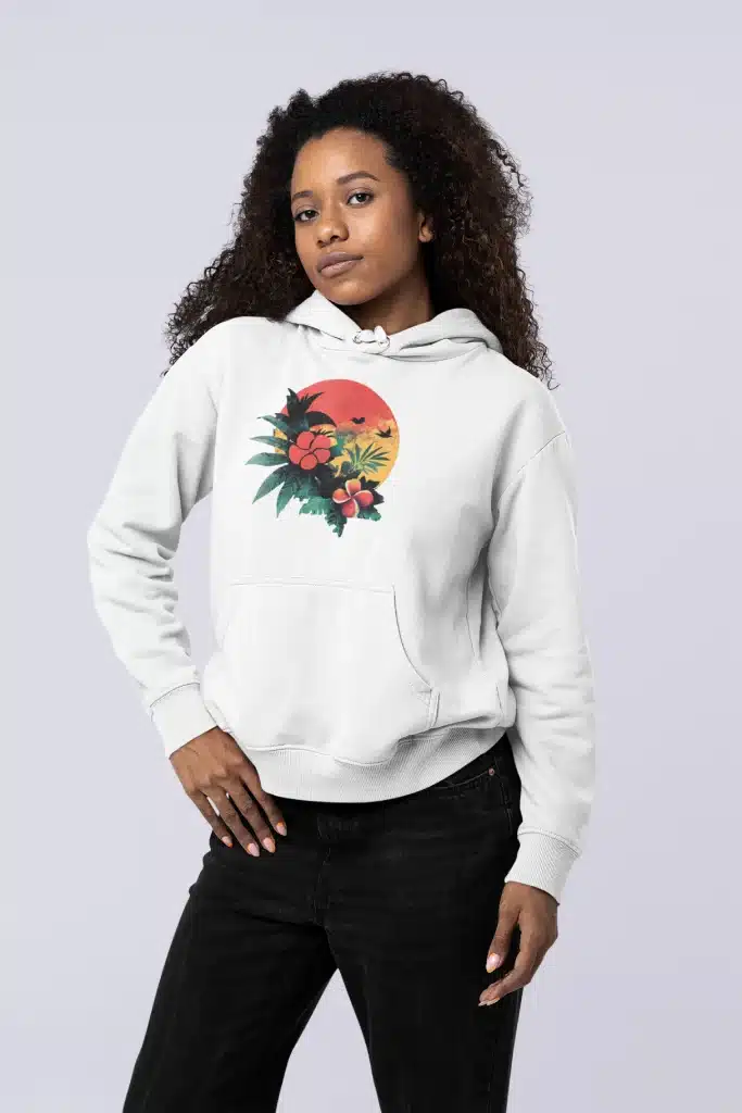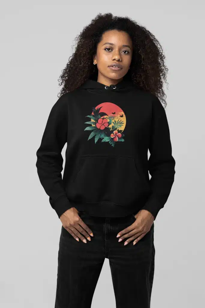 Le hoodie floral exotique noir met en avant un magnifique design représentant un coucher de soleil tropical accompagné de fleurs exotiques. Les couleurs éclatantes, comme le rouge, le vert et l’orange, créent une harmonie visuelle qui attire immédiatement l’attention. Ce motif est parfait pour ceux et celles qui souhaitent ajouter une touche d’évasion et de fraîcheur à leur tenue.