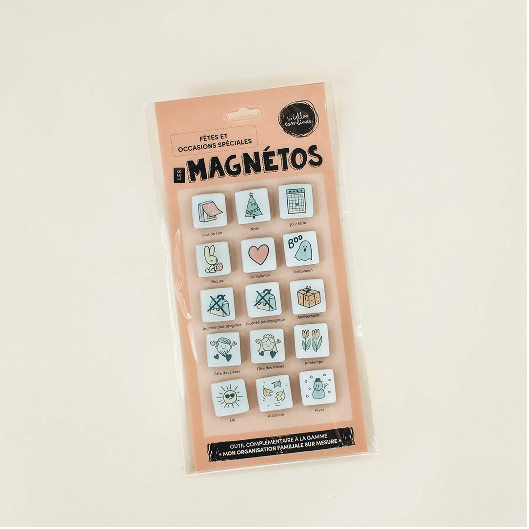 Ensemble de 15 aimants super adhérents et incassables. Contient : Jour de l’an Noël Jour férié Pâques St-Valentin Halloween Journée pédagogique (2x) Anniversaire Fête des pères Fête des mères Printemps Été Automne Hiver Âge recommandé : 3 à 12 ans