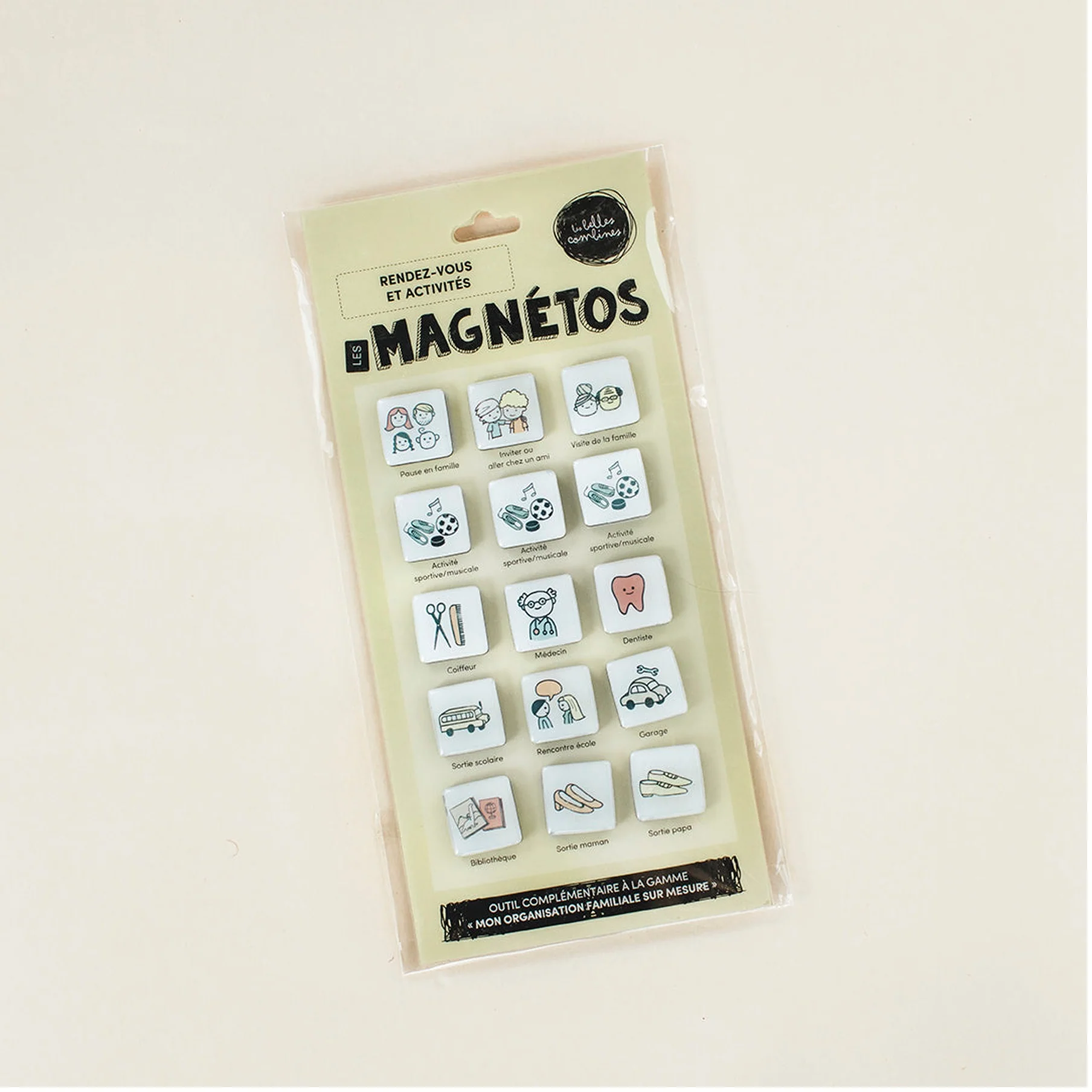 Ensemble de 15 aimants super adhérents et incassables. Inclus : Pause en famille Inviter ou aller chez un ami Visite de la famille Activité sportive/musicale (3x) Coiffeur Médecin Dentiste Sortie scolaire Rencontre école Garage Bibliothèque Sortie maman Sortie papa Âge recommandé : 3 à 12 ans Dimension (po) : 1
