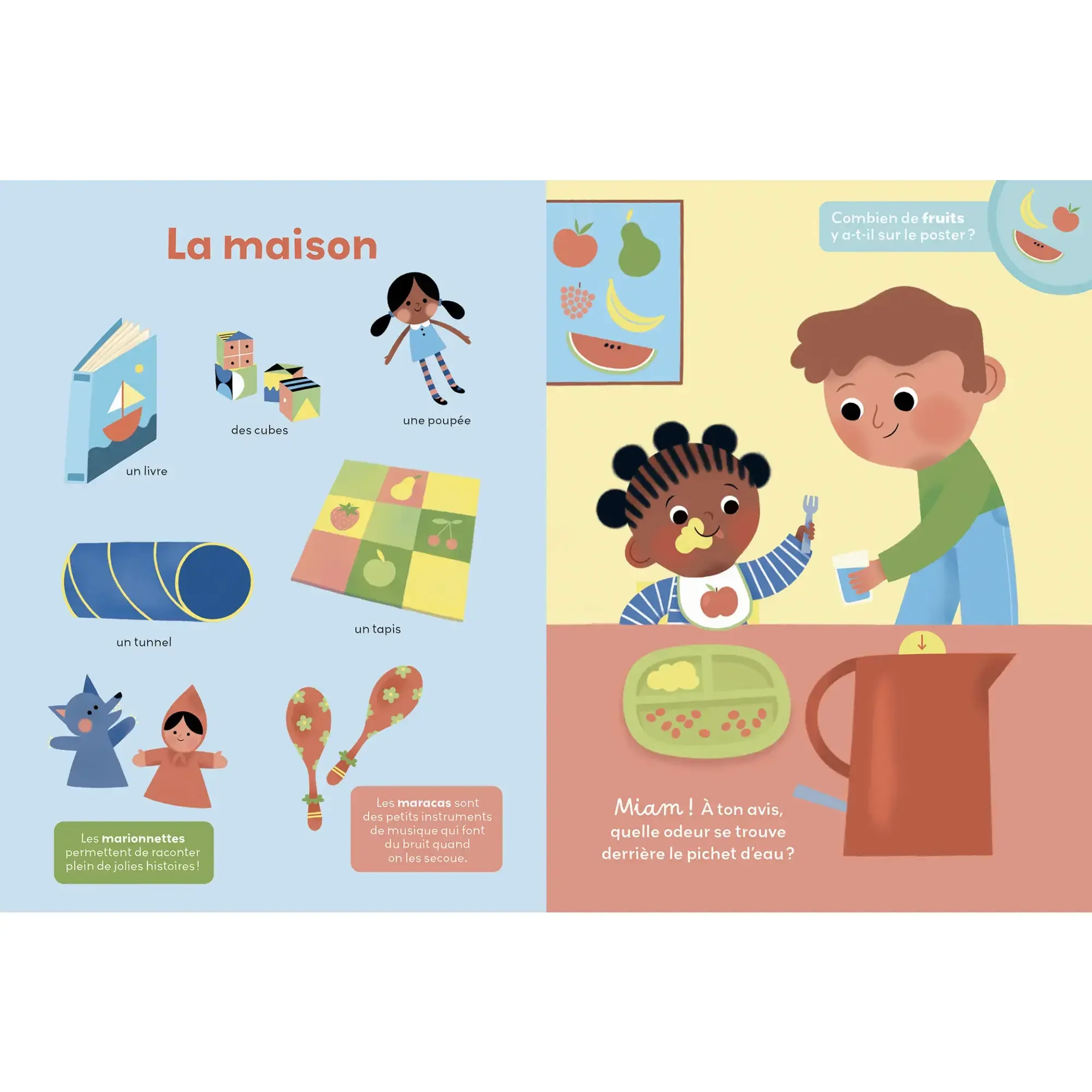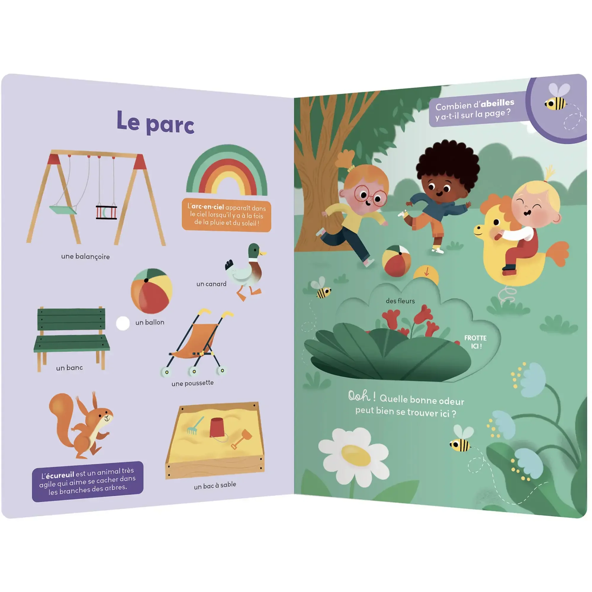 Sur chaque double-page, l’enfant pourra découvrir des informations étonnantes, jouer à compter des éléments (jusque 10) et entraîner sa motricité fine grâce à un grand flap qui cache une odeur amusante !