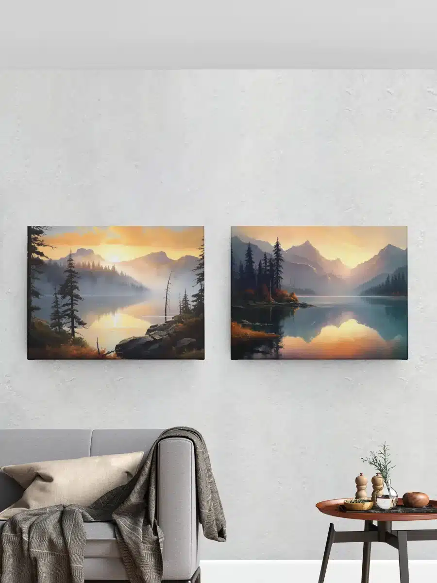 Paysage lac montagneux  met en avant un lac serein entouré de montagnes majestueuses, baigné par une lumière douce et chaleureuse. Grâce à ses détails minutieux, il capture parfaitement la beauté de la nature, créant une atmosphère apaisante dans n’importe quel espace.