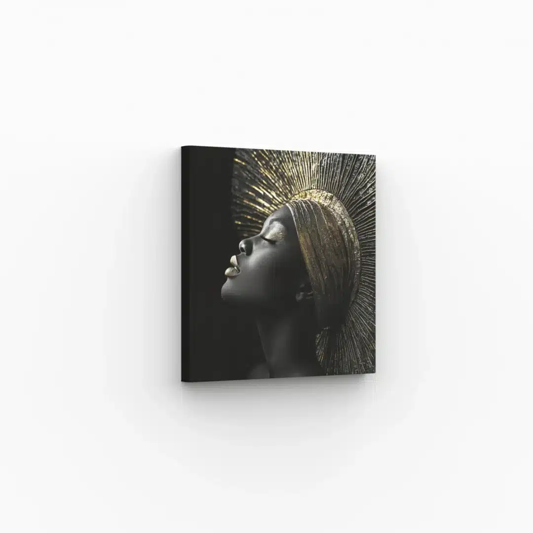 Portrait doré artistique ,ce tableau met en lumière un portrait artistique d’une élégance exceptionnelle. Les textures dorées scintillantes contrastent magnifiquement avec les noirs profonds, créant un effet visuel puissant. De plus, l’attention portée aux détails, des reflets dorés sur la peau jusqu’à l’effet métallique du couvre-chef, confère une dimension unique et intemporelle à cette œuvre. Par ailleurs, ce tableau trouve parfaitement sa place dans les intérieurs modernes et contemporains, ajoutant une touche de sophistication et de caractère à vos murs.