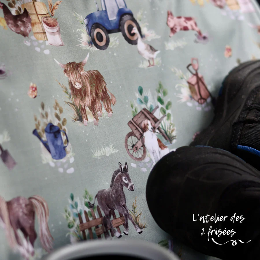 Matériaux : Fait de tissu imperméable à l’avant et de polar à l’arrière. Le tissu imperméable est du PUL donc l’eau ne perle pas dessus, ce qui est parfait pour la neige qui se retrouve sur les bottes à l’hiver. L’autre avantage du PUL, c’est qu’il est facilement lavable avec un linge humide et restera donc beau tout l’hiver!