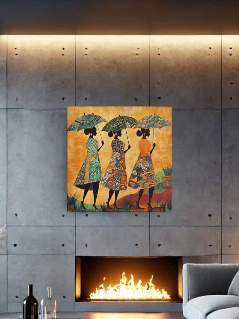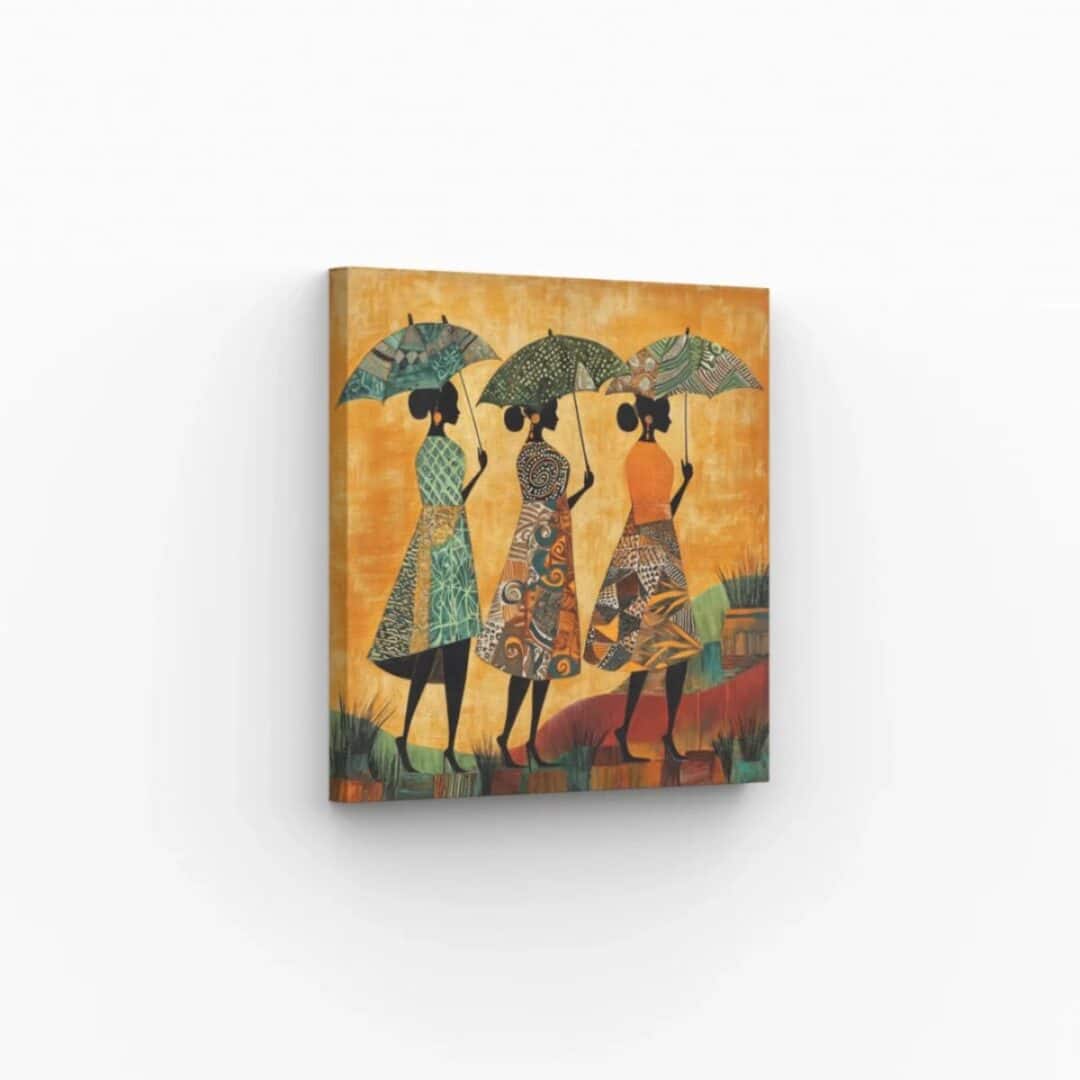 Tableau femmes africaines parasols met en lumière la grâce et l’élégance des femmes africaines dans une scène vivante et colorée. Chaque femme porte une robe ornée de motifs traditionnels qui célèbrent la diversité et la richesse culturelle. Les parasols qu’elles tiennent ajoutent une touche poétique à cette composition unique.