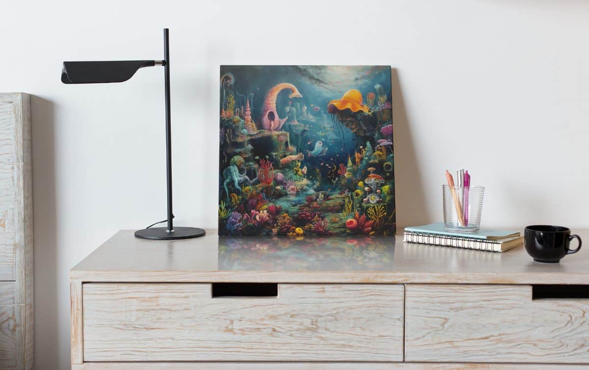 Tableau fond marin fantastique : Plongez dans un univers magique avec ce tableau fascinant qui met en scène un monde sous-marin fantastique. Les détails minutieux des coraux, des créatures marines imaginaires et des couleurs éclatantes créent une œuvre unique et captivante. Chaque élément raconte une histoire qui transporte l’observateur dans un voyage extraordinaire sous les océans.