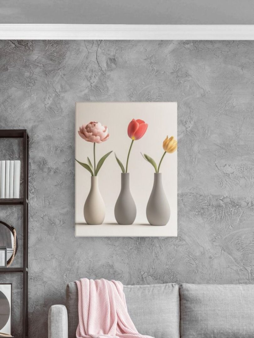 Découvrez le tableau tulipes et vases modernes, une œuvre artistique délicate mettant en scène des tulipes élégantes dans des vases minimalistes. Parfait pour une décoration contemporaine et apaisante.