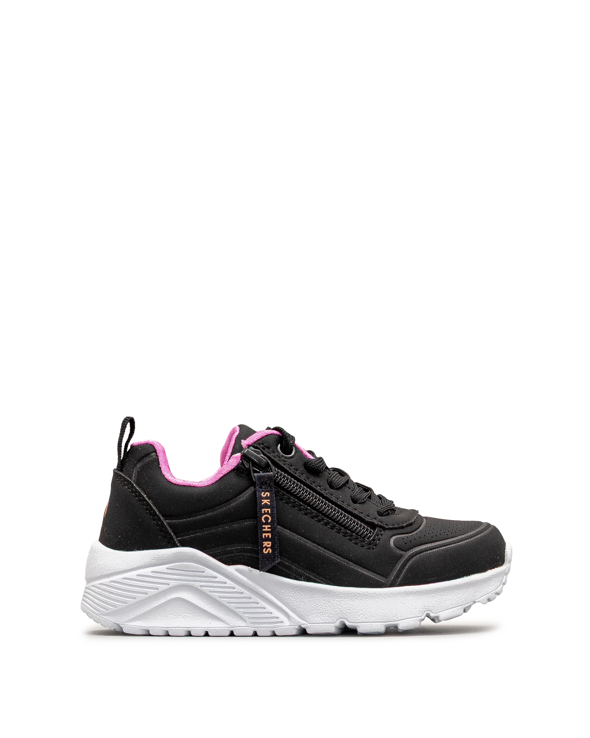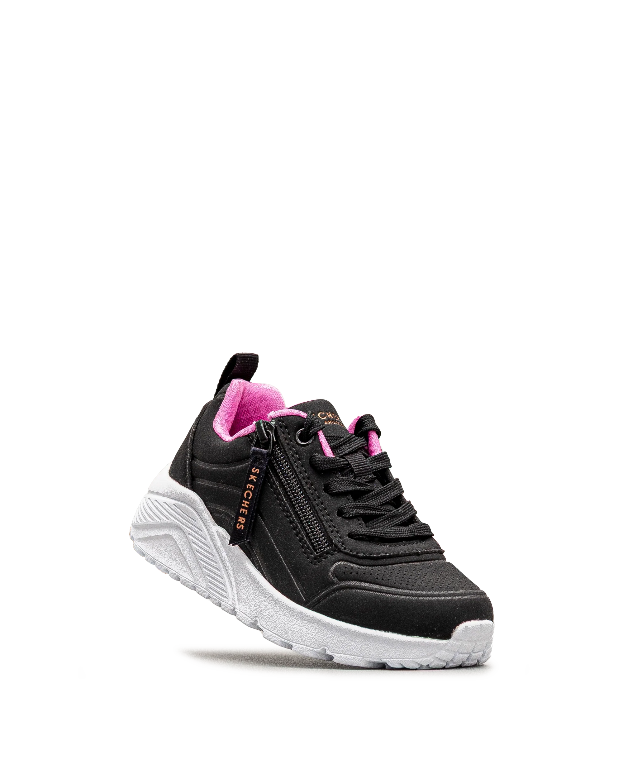 Ces chaussures Skechers noires offrent un style contemporain pour les jeunes en mouvement. Leur semelle épaisse assure un bon amorti au quotidien. Dotées d’une fermeture éclair latérale, elles sont faciles à enfiler et à retirer. Une chaussure polyvalente pour un usage scolaire ou décontracté.